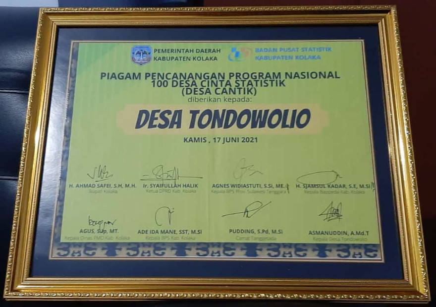 Terimah Kasih tak terhingga kami ucapkan kepada Badan Statistik Kab. Kolaka yang telah berupaya dan berkontribusi kepada Desa Tondowolio untuk masuk sebagai Desa 100 Desa Cinta Statistik (Desa Cantik)